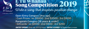 The winners of the fourth annual E Tū Whānau Song Competition have now been confirmed. “It’s such a privilege to have been part of this initiative,” says Betty-Anne Monga, one of the judges. “The songwriting was exceptional, with entries in the rangatahi category showing real depth and honesty.” Entrants were asked to write an original … Continue reading E Tū Whānau Song Comp 2019 winners